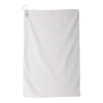 Carmel Towels 15” x 18” Microfiber Golf Towel With Grommet. Serged edges. Silver corner grommet and hook. Flat-faced microfiber front for easy embellishment. 0.8 lbs per dozen. Non-branded label/tag.