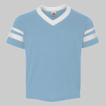 Augusta Youth 4.8 Ounces Poly/Cotton Stripe Sleeve Jerseys. 4.8 ounce, 50/50 polyester/cotton jersey knit fabric with contrast color v-neck collar and sleeve stripes. Set-in-sleeves. Ships from Grovetown, GA.